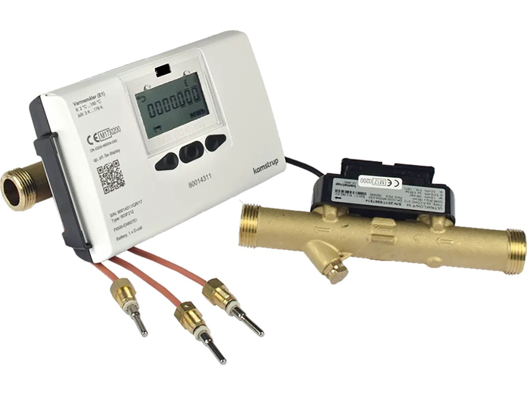 Ciepłomierz oparty jest na przeliczniku MULTICAL® 603-E oraz ultradźwiękowym przetworniku przepływu Ultraflow®54 wyposażonym w kabel sygnałowy o długości 2,5 m. Przetwornik ten wykonany jest z materiałów odpornych na odcynkowanie, co umożliwia pracę w trudnych warunkach eksploatacyjnych, przy temperaturach medium do 130 °C. Ultrasonografia stosowana w urządzeniu opiera się na zasadzie różnicy czasów propagacji sygnału ultradźwiękowego, co zapewnia długotrwałą stabilność pomiaru przepływu. Pomiar dokonywany jest bezkontaktowo, co minimalizuje straty ciśnienia oraz wpływ czynnika przepływu na konstrukcję urządzenia.Urządzenie dostarczane jest wraz z kompletem śrub montażowych oraz uszczelek kołnierzowych, które zapewniają odpowiednie uszczelnienie i ochronę przed wyciekami oraz wpływem czynników zewnętrznych. Zasilanie urządzenia realizowane jest za pomocą baterii D-cell, której żywotność wynosi do 16 lat. W zestawie znajduje się para czujników temperatury Pt500 do montażu w tulejach, wyposażona w kabel o długości 3 m. Czujniki zapewniają precyzyjny pomiar temperatury czynnika przepływającego przez instalację, zarówno w punkcie poboru ciepła, jak i na jego powrocie. Konstrukcja ciepłomierza charakteryzuje się modułową budową, umożliwiającą konfigurację parametrów bezpośrednio na miejscu instalacji. Dzięki temu możliwe jest dostosowanie ustawień takich jak jednostka energii czy parametry rejestracji danych, co usprawnia proces rozliczeń i optymalizację pracy systemu grzewczego. Urządzenie posiada wyświetlacz LCD, który zapewnia czytelny odczyt danych takich jak bieżące zużycie energii, stan pracy czujników oraz parametry pracy przetwornika.