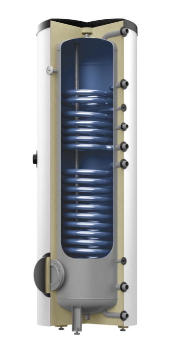 Podgrzewacz wyposażony jest w dwie wewnętrzne karbowane wężownice umożliwiające obsługę dwóch różnych źródeł ciepła. Zasobnik wykonany jest ze stali zabezpieczonej powłoką emaliowaną zgodną z normą DIN 4753 T3. Izolację podgrzewacza stanowi 75-milimetrowa warstwa pianki poliuretanowej (PUR) pokrytej płaszczem foliowym.