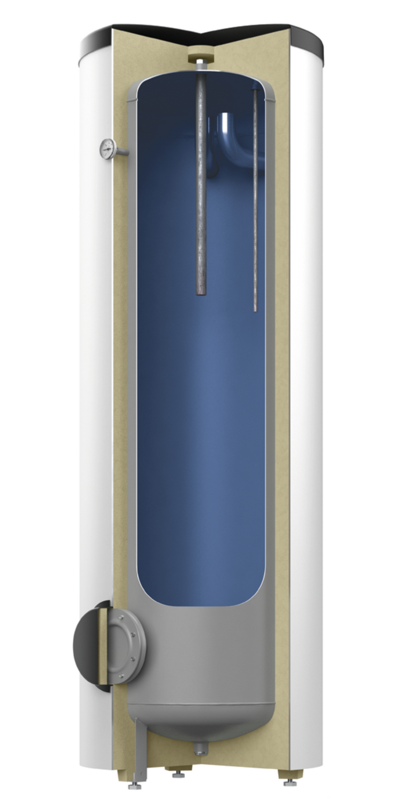 Zasobnik wykonany jest ze stali zabezpieczonej powłoką emaliowaną zgodną z normą DIN 4753 T3. Izolację podgrzewacza stanowi 45-milimetrowa warstwa pianki poliuretanowej (PUR) pokrytej płaszczem foliowym.
