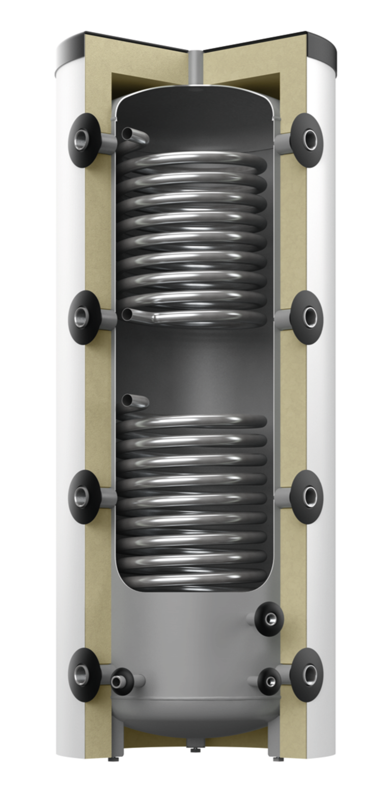 Zasobnik wyposażony jest w dwie wewnętrzne karbowane wężownice, które umożliwiają podłączenie dwóch niezależnych źródeł ciepła, takich jak kotły, pompy ciepła lub instalacje solarne. Urządzenie posiada otwór rewizyjny, który ułatwia kontrolę stanu wnętrza oraz konserwację zasobnika. Otwór rewizyjny umożliwia oczyszczanie zbiornika z osadów i kamienia kotłowego, które mogą się gromadzić podczas eksploatacji. Powierzchnia zewnętrzna zasobnika jest zabezpieczona antykorozyjnie. Izolację zasobnika stanowi 100-milimetrowa warstwa pianki poliuretanowej (PUR), pokryta płaszczem foliowym.