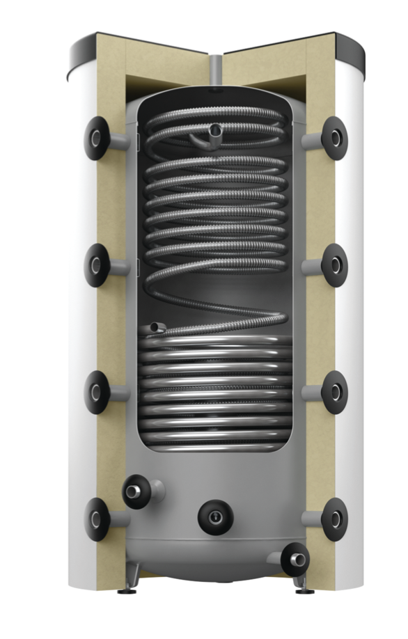 Zbiornik wykonany ze stali wysokiej jakości, wewnątrz w stanie surowym, na zewnątrz powłoka z tworzywa sztucznego. Przygotowanie ciepłej wody ma miejsce w karbowanej wężownicy o dużej pojemności
