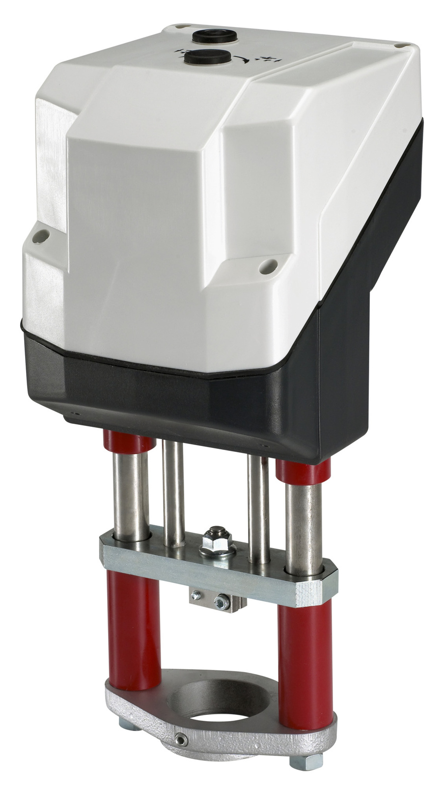 Siłownik stanowi kompletny zespół napędowy z silnikiem elektrycznym, przekładnią oraz mechanizmem przetwarzającym ruch obrotowy na liniowy przesuw trzpienia. Obudowa o stopniu szczelności dostosowanym do typowych pomieszczeń technicznych chroni elementy robocze przed zapyleniem i zawilgoceniem, a klasa ochrony elektrycznej odpowiednia dla wersji 24 V pozwala na bezpieczną eksploatację w instalacjach budynkowych. Sterowanie trójpunktowe umożliwia współpracę z szeroką gamą regulatorów i automatyką nadrzędną, zapewniając precyzyjne domykanie i otwieranie zaworu. Wbudowana obsługa ręczna pozwala na ustawienie położenia zaworu podczas uruchomienia lub serwisu, bez konieczności zasilania. Zastosowany napęd zapewnia wysoką siłę liniową, dzięki czemu siłownik może pracować z zaworami o większych średnicach i w instalacjach o podwyższonych wymaganiach co do szczelności zamknięcia.