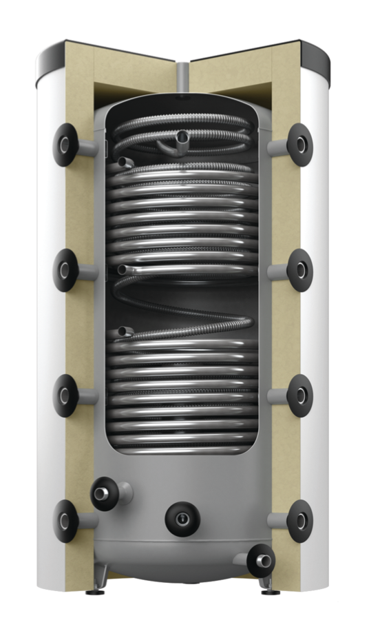 Zbiornik wykonany ze stali wysokiej jakości, wewnątrz w stanie surowym, na zewnątrz powłoka z tworzywa sztucznego. Przygotowanie ciepłej wody ma miejsce w karbowanej wężownicy o dużej pojemności