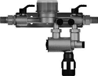 Urządzenie wyposażone jest w kulowe zawory odcinające służące do kontroli przepływu wody. W skład zestawu wchodzi rozdzielacz systemów z wbudowanym osadnikiem zanieczyszczeń oraz wodomierz kontaktowy umożliwiający zdalne przekazywanie informacji o przepływie. Armaturę można zamontować na ścianie w poziomie.