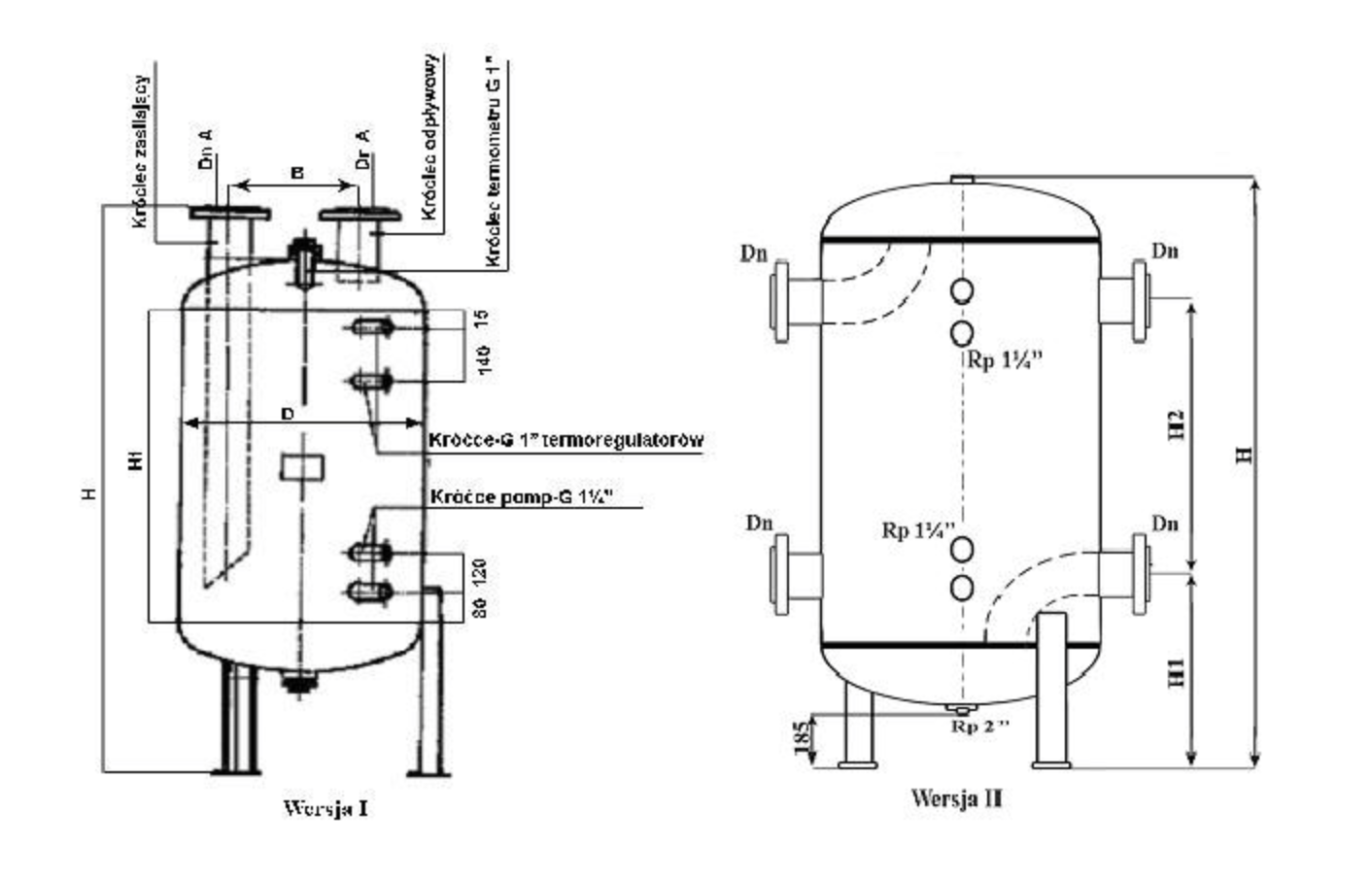 - w dennicy górnej znajduje się króciec G1” do montażu termometru oraz króciec technologiczny G2”
